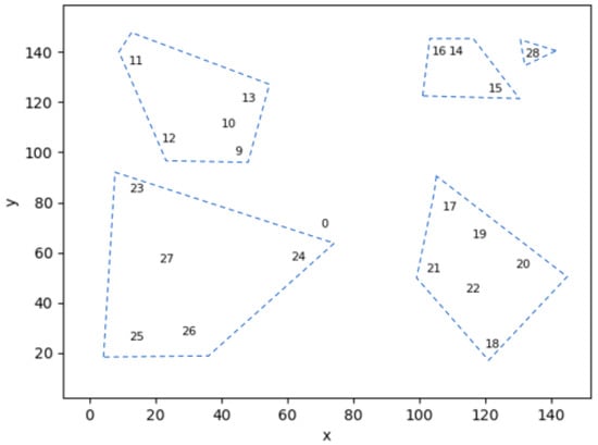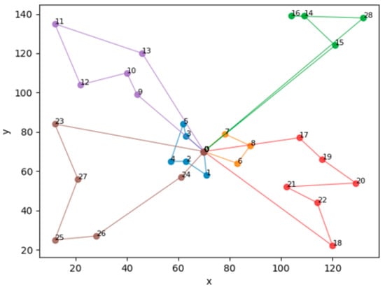 - The clustered vehicle routing problem (CluVRP) was first proposed by Sevaux and Sorensen [] in 2008. It requires grouping customers or locations into different clusters based on their similarity to each other and then planning vehicle routes for each cluster. Each cluster can be viewed as a small subproblem containing a set of customers or locations that need to be served on the same path. For each cluster, vehicle paths must then be planned in such a way that the customers within each cluster are served while meeting certain constraints (e.g., time windows, capacity limits, etc.).