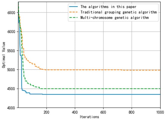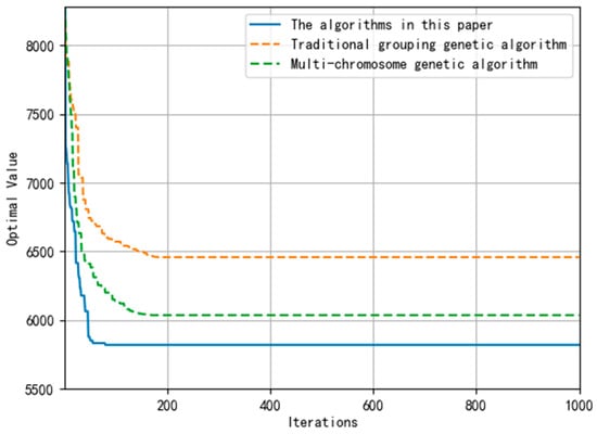 To verify the effectiveness and superiority of the algorithm proposed in this paper, the algorithm in this paper and the multi-chromosome genetic algorithm [], which has better solution performance and convergence speed, as well as the traditional grouping genetic algorithm, which does not employ optimization strategies, were used to carry out simulation calculations for the two cases. The number of iterations was taken as 1000 and repeated 20 times, and the value of each iteration was taken as the average of the 20 trials. The results obtained are shown in Figure 21 and Figure 22.