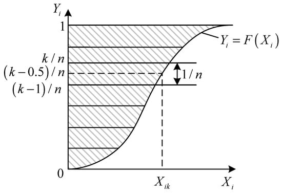 Figure 1 shows the Latin hypercube sampling with input random variables. In this process, the input random variable is . If is the -th random variable, each input variable is sampled to obtain samples, is the probability distribution function of . is further divided into intervals on average. For example, . For , its corresponding -th sampling value is , as shown in Formula (9).
