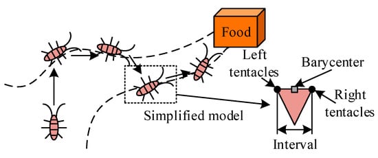 Firstly, the centroid of the beetle is a fixed point, with its antennae located on either side of that point. Then the search step of the beetle is , and the distance between the two antennae is . The ratio between the two is fixed, as shown in Formula (10).