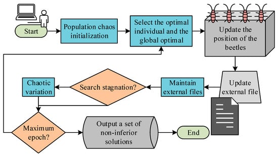 To address these issues, a new strategy is adopted in this study, which is to introduce the SA to improve the BAS. The SA is a probabilistic search algorithm inspired by the solid-state annealing process, which simulates the temperature drop and energy minimization during the solid-state annealing process to find the global optimal solution. During the search process, the SA accepts solutions that are better than the current solution. It also has a certain probability of accepting worse solutions, thereby avoiding falling into local optima. Therefore, the SA is introduced into the BAS, which can effectively avoid becoming stuck in local optima, improve search efficiency, and accelerate convergence speed, finding better solutions on a global scale. This improvement strategy provides new possibilities for dealing with complex MOO problems. It is expected to achieve better application results in practical problems. According to the Metropolis criterion, if the energy in state is , then the energy in the next state is . The probability is specifically shown in Formula (15).