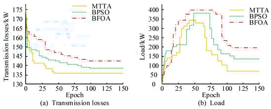 The iterative performance of the three models was tested, and the test index was the transmission loss and the load of the grid output by the three models in the iterative process. The Transmission loss/Kw refers to the power loss of the grid during transmission, and the Load/Kw refers to the load of the power grid. The epoch indicates the number of iterations. The test results are shown in Figure 8. From Figure 8a, the proposed MTTA model had the best iterative performance. Its convergence speed was better. It achieved optimal current loss at a faster speed. From Figure 8b, the proposed MTTA model had the best convergence performance, with a lower peak load and the ability to reach the optimal load value at a faster speed.