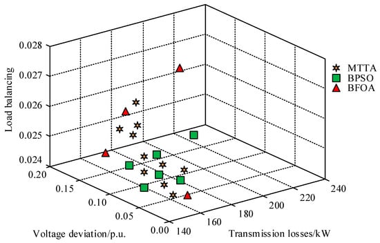 The three-dimensional spatial solution sets of three models were tested and compared. The dimensions specifically included transmission loss, voltage deviation, and load balancing. Load balancing indicates the balance of the overall load of the power grid, Voltage deviation indicates the deviation of the output voltage of the power grid, and Transmission losses indicate the losses of the power grid during transmission. The test results are shown in Figure 9. From Figure 9, the proposed MTTA model obtained a larger set of solutions for the three objective optimization problems. It covered a wider solution space, with better diversity of types.