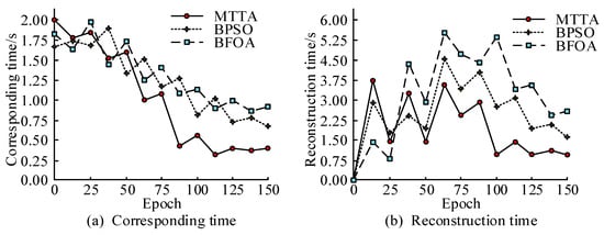 The reconstruction time of three models was tested, including model response time and reconstruction time. The test results are shown in Figure 10. Corresponding time indicates the response time of the model, and Reconstruction time indicates the reconstruction time of the model. From Figure 10a, the proposed MTTA model had the best response time of 0.41 s. Compared with the BPSO model and BFOA model, it was 0.72 s and 0.93 s faster, respectively. From Figure 10b, the proposed MTTA model had the best reconstruction time of 0.83 s. Compared with the BPSO model and BFOA model, it was 0.24 s and 0.62 s faster, respectively.