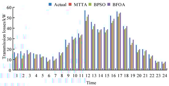 The reconstruction performance of three models was tested. The test content is the transmission loss of the power grid before and after reconstruction. The test results are shown in Figure 11. From Figure 11, the proposed MTTA algorithm could effectively reduce power grid transmission losses, with a reduction range of 16.7–18.6%, far higher than the BPSO model and BFOA model.