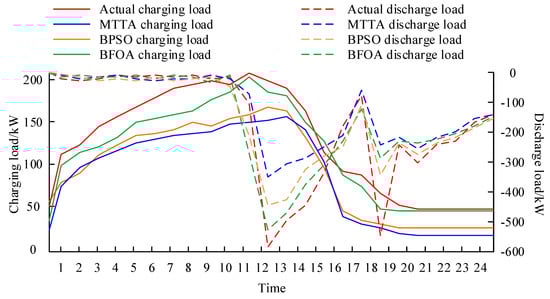The charging and discharging loads before and after the reconstruction of the three models were tested. The test results are shown in Figure 12. The charging load indicates the charging load of the power grid, and the discharge load indicates the discharge load of the power grid. From Figure 12, after reconstructing the MTTA model, the charging and discharging loads were effectively reduced. The reduction rate reached 16.2–19.7%.