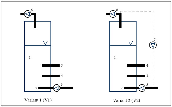 Scheme of the V-PBRs. Variant 1: (1) V-PBR culture medium; (2) supply of pressurised air to the culture medium; (3) air supply pump; (4) sampling of cyanobacterial biomass; (5) pH measurement; (6) pump for gas removal. Variant 2: (1) V-PBR culture medium; (2) supply of pressurised air to the culture medium; (3) air supply pump; (4) sampling of the cyanobacterial biomass; (4) pH measurement; (6) pump for gas removal; (7) pump for gas recirculation.