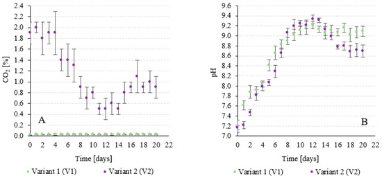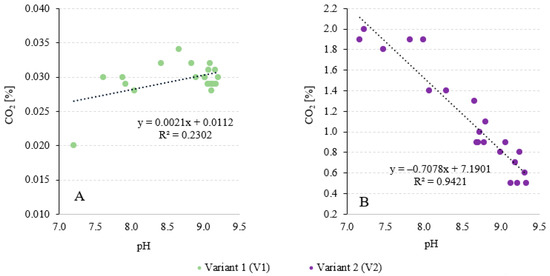Relationships between the CO2 content in the gases obtained from the V-PBR and the pH value in variant 1 (A) and variant 2 (B).