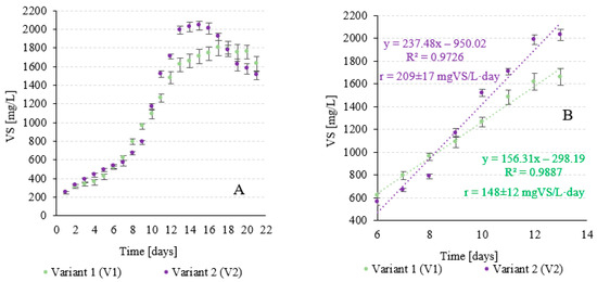 Significant differences in the rate and amount of cyanobacteria biomass produced were found depending on the variant. Both V1 and V2 were in the lag phase during the first 6 days, and the differences in the achieved efficiency of biomass growth were not significant. In V1, the biomass concentration of A. platensis increased from 250 ± 11 mgVS/L to 621 ± 24 mgVS/L. In V2, an increase from 250 ± 13 mgVS/L to 566 ± 32 mgVS/L was observed (Figure 5A). In the logarithmic growth phase, the biomass growth rate was 148 ± 12 mgVS/L-d in V1 and 209 ± 17 mgVS/L-d in V2. The observed differences were statistically significant (Figure 5B).