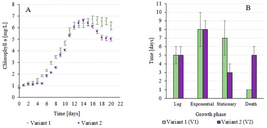 Duration of the subsequent growth phases of A. platensis (A) and recorded concentrations of chlorophyll a in V-PBR (B) depending on the experimental variant.