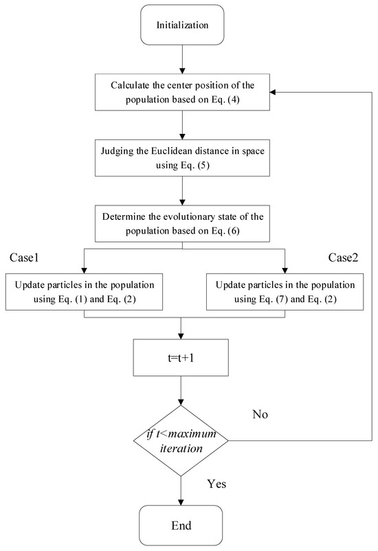 Case (3)—Balance: When fB is a relatively middle value (e.g., smaller than the threshold 0.4 and larger than the threshold 0.3), we maintain the learning strategy of the whole population unchanged to achieve a balance between exploration and exploitation. When the evolutionary state has been estimated, we can control the mutation strategy adaptively. Different learning strategies are used according to the population state, to ensure the whole population diversity. In this way, the whole population can achieve a balance between exploration and exploitation. The flowchart of the algorithm is shown in Figure 1. All input and output parameters have been explained in the corresponding sections of the text, and detailed explanations will not be provided here.