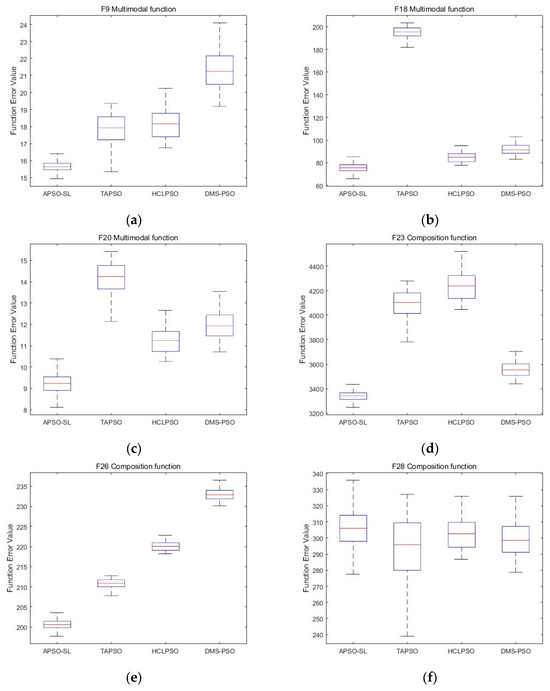 Box-plot figures of peer methods on CEC2013. (a) f09; (b) f18; (c) f20; (d) f23; (e) f26; (f) f28.