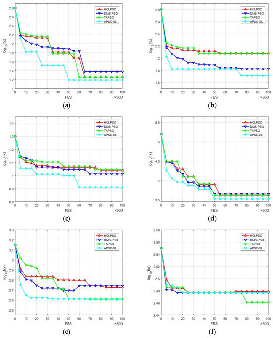 Convergence characteristic of APSO-SL and other methods. (a) f09; (b) f18; (c) f20; (d) f23; (e) f26; (f) f28.