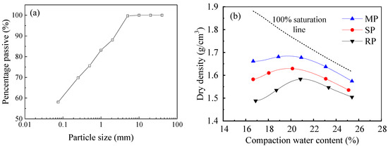 (a) The grain-size distribution of tested soil and (b) the proctor curves under different compaction energies.
