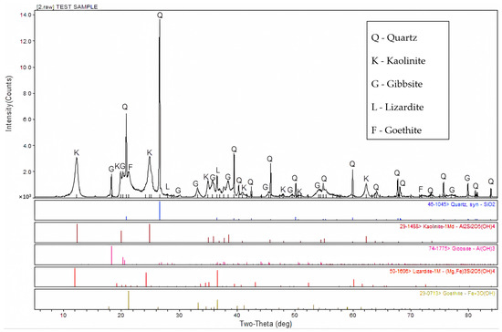 The material utilized in this study was a granite residual soil sampled from Jiangxi, China, with the grain-size distribution curve presented in Figure 1a. The physical properties of the soil were measured following Chinese standard JTG 3430-2020 (2020) [40] and are shown in Table 2. According to the Unified Soil Classification System, the tested soil was classified as a fine-grained high-liquid limit clay (CH). Also, the chemical composition of the tested granite residual soil was analyzed using X-ray powder diffraction (XRD) to obtain X-ray diffraction patterns [41,42,43]. Subsequently, semi-quantitative analysis was conducted using JADE software, as shown in Figure 2. Results indicate that the soil mainly comprises quartz and kaolinite, along with gibbsite, lizardite, and goethite.