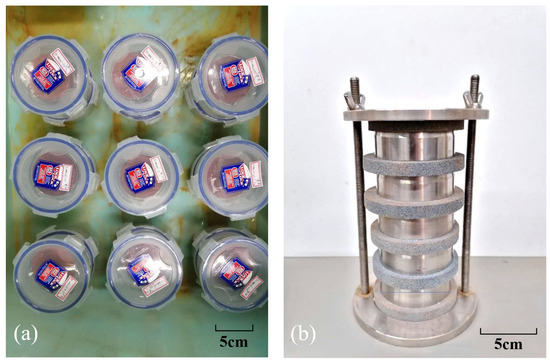 In this paper, the Whatman No. 42 filter paper with a 4.5 cm diameter was utilized. To ensure consistency in the initial conditions, the tested granite residual soil was compacted under the selected initial condition in a cutting ring measuring 6.18 cm in diameter and 2 cm in height, and was vapor-moistened or air-dried to eight different water contents around OMC, specifically OMC − 11.5%, −9.5%, −7.5%, −5%, −2.5%, +0%, +2.5%, +5%. Subsequently, a filter paper was placed between two soil specimens, and the specimens were placed inside a sealed box for 14 days to attain suction equilibrium, as depicted in Figure 3a. After that, the filter paper was weighed using an analytical balance with an accuracy of 0.0001 g. The calibration curve between the water content of the filter paper (wfp) and the matric suction (s) of soils is represented by Equation (1), following ASTM D5298-16 testing protocols [44]: