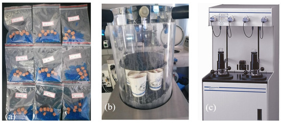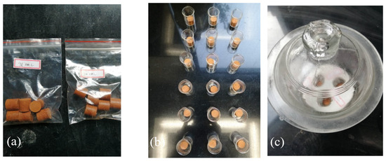 (a) The compacted soil specimens, (b) the glass beaker and (c) the sealed containers containing selected supersaturated salt solutions.
