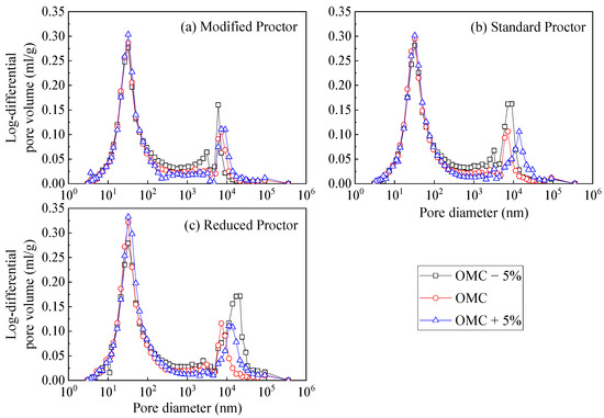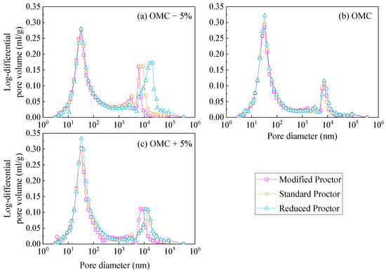 Comparison of the pore size distribution under different compaction water contents: (a) OMC − 5%, (b) OMC and (c) OMC + 5%.