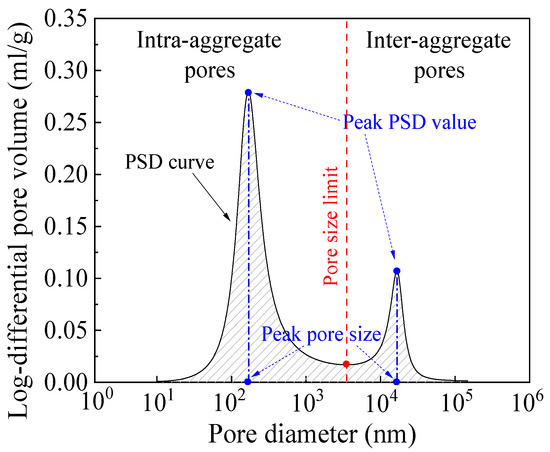 To quantitatively analyze the pore size distribution characteristics, the bimodal pore structure is divided into two categories, as depicted in Figure 8. The diameter corresponding to the point of zero slope on the PSD curve is chosen to separate the two pore categories, and, thus, the total void ratio measured by MIP tests (et), inter-aggregate void ratio (einter), intra-aggregate void ratio (eintra), the proportion of intra-aggregate pores (pintra) [48], and the water ratio (ew) [47] can be calculated, as expressed in Equation (2) through Equation (6).