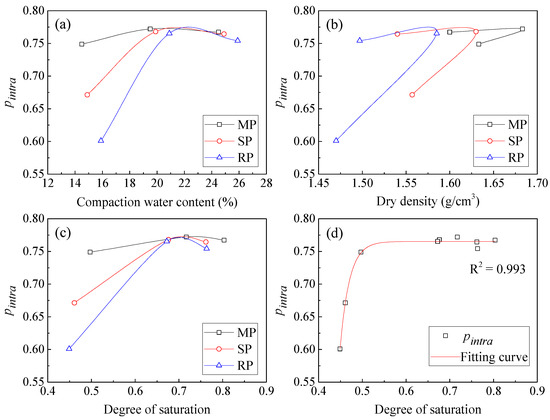 The variation of the pore size distribution among the different initial conditions can be quantitatively captured by the pintra, which can capture the proportion of nearly intact intra-aggregate pores and changeable inter-aggregate pores. To correlate PSD with the initial conditions, the pintra is compared with the compaction water contents, dry density, and degree of saturation, respectively. Figure 9a shows that the pintra values for the specimens compacted at the dry side are separated from each other, while for the OMC and OMC + 5% conditions, the pintra values are nearly independent of proctor types. Figure 9b shows that an increased compaction energy reduces the variation in pintra. In addition, soil specimens with similar dry densities have different pintra values, which verify the results in related research that the soil compacted at the dry side or wet side show different pore structures [50]. Figure 9c shows that the relationship between the degree of saturation and pintra can be described by the single-valued function, and the exponential fitting curve is depicted in Figure 9d. Thus, the pore size distribution parameter and initial condition parameter can be quantitatively correlated.