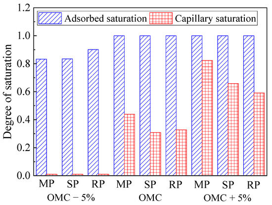 It can be seen from Figure 10 that the intra-aggregate pores are not saturated under OMC − 5%, while for the OMC and OMC + 5% conditions, the intra-aggregate pores are fully saturated, and the capillary water fills in the inter-aggregate pores at different degrees. As the compaction water content increases from OMC − 5% to OMC, the filling of adsorbed water affects the volume and size of the aggregates significantly, thus affecting the PSD curve and corresponding pintra significantly. Once filled into the pores, the adsorbed water forms strong contact with the soil particles and is hard to dewater by the compaction effect. Thus, the pore structure becomes stable after the Sr, a reach 1.0. As the compaction water content increases from OMC to OMC + 5%, the pore structure is also affected by the Sr, c. Since the inter-aggregate pores occupy a relatively small proportion in the pore structure of the test soil, the PSD and corresponding pintra are less sensitive to the change in compaction water content and compaction effort, compared with the dry side.