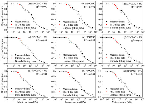 Determination of bimodal SWCCs for the selected initial conditions: (a) MP OMC − 5%, (b) MP OMC, (c) MP OMC + 5%, (d) SP OMC − 5%, (e) SP OMC, (f) SP OMC + 5%, (g) RP OMC − 5%, (h) RP OMC and (i) RP OMC + 5%.