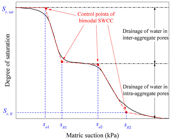 In this equation, Sr, sat represents the degree of saturation under the fully saturated condition, Sr, R represents the residual degree of saturation, sa1 and sa2 are the air-entry values of inter-aggregate and intra-aggregate pores, and sR1 and sR2 represent the residual suction of inter-aggregate and intra-aggregate pores, respectively.