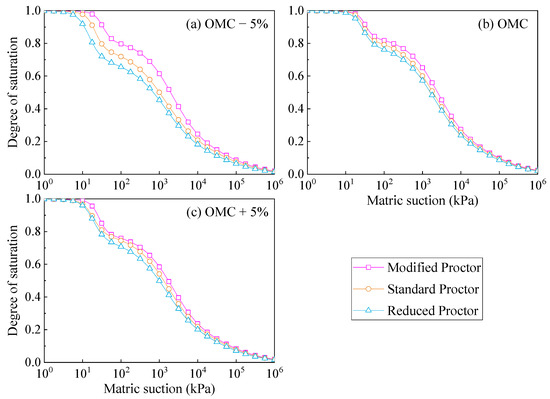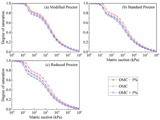 Figure 14 shows that, for the same compaction water content type (i.e., OMC − 5%), an increased compaction energy improves the water retention capacity of compacted soil. For specimens compacted at the dry side, an increased compaction energy improves the water retention capacity significantly. In contrast, for the soil specimens compacted at OMC and OMC + 5%, the SWCC is less affected by the compaction energy.