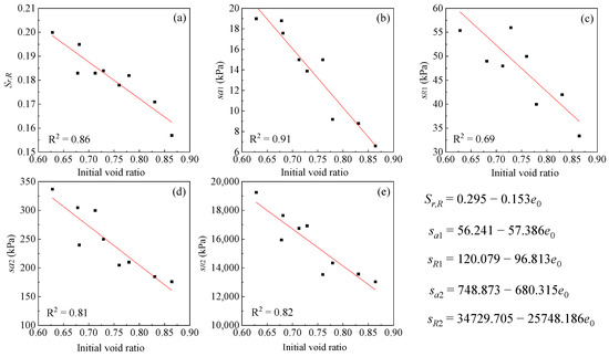 The analysis above suggests that the pore structure and the SWCC are closely correlated with the initial conditions. To facilitate the application of the SWCC, a single equation can be established to describe the water retention capacity of the granite residual soil under the various initial conditions by extending the equation from 2D to 3D. Considering the formation of existing 3D SWCC functions [35,36,39], the initial void ratio is selected as the third variable to characterize the influence of the initial conditions on the SWCC. Figure 15 shows the correlation of the initial void ratio e0 and all the five SWCC fitting parameters. It can be seen that all relationships can be described using linear fitting, and the equations are also listed in Figure 15.