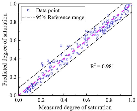 The 3D SWCC equation and all the test data are depicted in Figure 16. It can be seen that the proposed 3D SWCC equation can capture the main characteristics of the bimodal SWCC and its variations among the different initial conditions. Figure 17 shows that the 3D bimodal SWCC equation fits the measured data well for the entire suction range with a high R2 value, which proves the effectiveness of the method used in this paper.