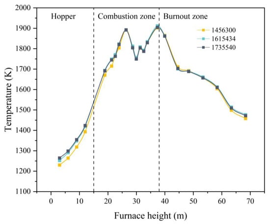 The mesh is regenerated after adding the burners. The structured mesh is shown in Figure 3. Mesh numbers of 1456300, 1615434, and 1735540 are employed for simulation calculations, respectively. The mesh independence is verified by comparing the temperature at three different meshes, as shown in Figure 4. The temperature at a mesh number of 1.45 million is lower than that at the other mesh numbers. To save computational resources and ensure accuracy, the mesh number of 1.61 million is adopted.