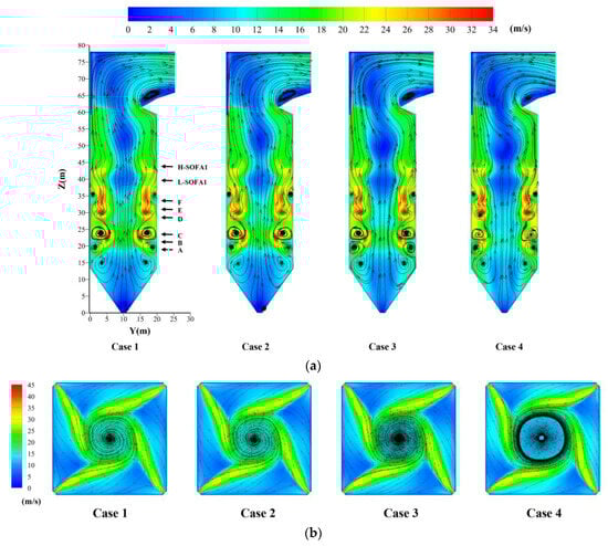 (a) Velocity distribution at the longitudinal section of the boiler; (b) velocity distribution in cross-section at burners in layer B.