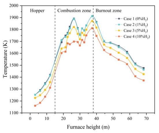 From Figure 6a, the temperature in the center zone gradually decreases as the percentage of hydrogen blending increases. The high-temperature zone produced by combustion is more concentrated at the wall. The overall combustion coincides with the flow field in Figure 5a. In the SOFA zone, the supplemental incoming SOFA allows the adequate combustion of unburned pulverized coal in Case 1. The temperature in this zone increased. In Cases 2–4, the temperature in this zone decreases when the percentage of hydrogen blending rises. The blending of hydrogen reduces the amount of pulverized coal, and the amount of unburned pulverized coal decreases. The amount of heat released from the adequate combustion of the pulverized coal here also decreases.