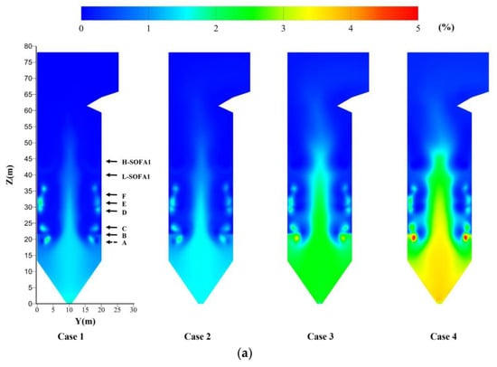 Figure 10a and Figure 11a show the O2 distribution at the longitudinal and cross sections of the boiler for different hydrogen blending ratios, respectively. In the hopper and combustion zone, the combustion of pulverized coal and hydrogen consumes a large amount of O2. In the combustion zone, the supplemental air gives a higher O2 concentration at the burner outlet, as shown in Figure 11a. In the SOFA zone, the supplemental air brought a higher concentration of O2. The amount of SOFA does not change, but the flue gas velocity is reduced. This affects the adequate combustion of pulverized coal, which leads to a lower amount of consumed O2. From Cases 1 to 4, the O2 concentration at the top gradually increased.