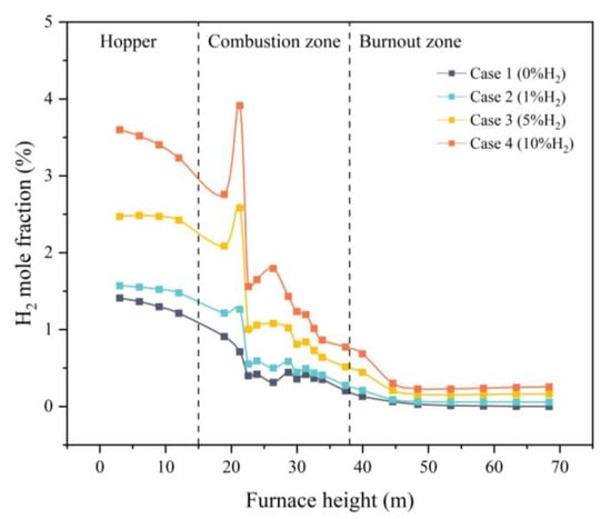 The variation in H2 concentration along the furnace height is shown in Figure 9. In Cases 1–4, the H2 concentration gradually increases with the increase in the hydrogen blending ratio. In conjunction with Figure 12a, the O2 concentration at the bottom is low and insufficient to support hydrogen combustion. As the height increased, the air was replenished from the burners, and the H2 concentration began to decrease. At the B-layer burners (at about 21.3 m), the addition of hydrogen gives a sudden increase in the H2 concentration. In Case 4, the H2 concentration reached a maximum of about 3.91%. In Cases 1–3, as the furnace height increased, the H2 concentration fluctuated slightly due to the combustion. And the concentration shows an overall decreasing trend. In Case 4, the concentration of H2 increases from 22.6 to 26.4m. The O2 concentration is relatively low between the two groups of burners. The combustion of hydrogen produces a certain amount of H2O. The reaction of H2O with char produces a certain amount of H2. From the upper burners to the top of the furnace, the large amount of O2 replenishment makes the H2 concentration decrease continuously. In the burnout zone, the H2 concentrations in Cases 1–4 are all maintained at a stable value. The H2 concentration in Case 4 is maintained at about 0.25% compared to the H2 concentration in Case 1, which tended to be zero.