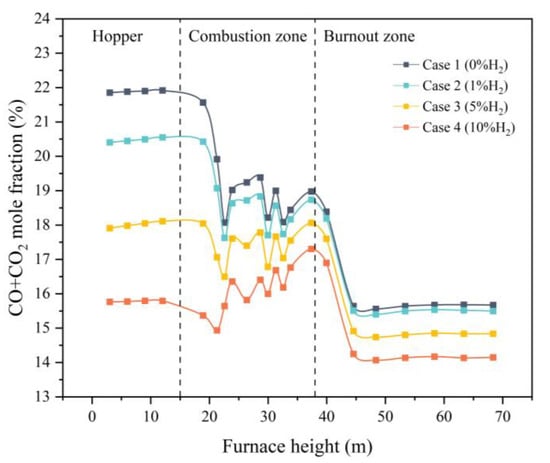 The average concentrations of CO+CO2 are displayed in Figure 13. From Case 1 to Case 4, the variation in CO+CO2 concentrations is opposite to H2O. The concentrations of CO + CO2 gradually decrease as the proportion of blended hydrogen increases. The combustion of H2 brings more H2O. The proportion of CO + CO2 produced by the combustion of pulverized coal is reduced. It is clear that H2 blending favors the reduction in CO + CO2 concentration.