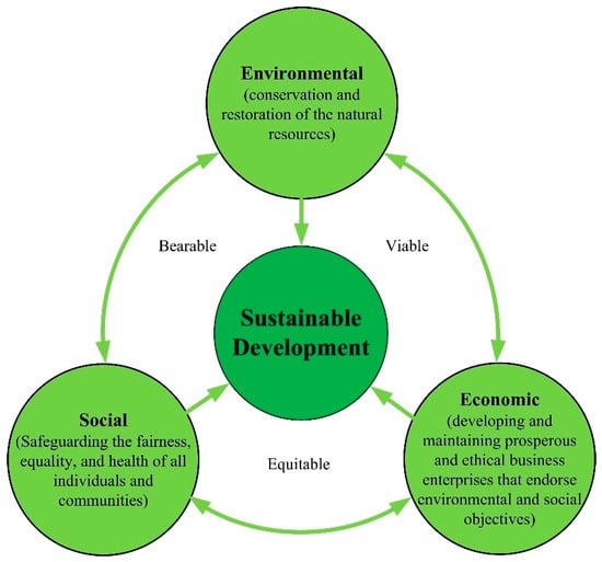 Energy and materials are vital resources for the expanding global economy, and their extraction from natural resources has negative environmental repercussions such as pollution, deforestation, biodiversity loss, and climate change. These environmental problems pose serious risks for life on the planet and are the drivers to adopt sustainable development. Sustainable development is defined as being able to meet current needs without endangering future generations’ ability to meet their own [1,2]. As shown in Figure 1, it is a notion that refers to the ability to carry out a particular activity indefinitely encompassing environmental, social, and economic aspects of development [2]. The manufacturing sector is one of the key contributors to economic growth, a major consumer of natural resources including energy and materials, and can make a substantial contribution to sustainable development. The manufacturing industry, as the backbone of every industrialized economy, presents challenges in addressing concerns of sustainability [3,4]. In the present scenario, sustainable manufacturing is now not only an obligatory standard but an opportunity to create global competitiveness and benefit the community [3].