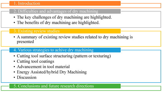 The remaining structure of the papers is as follows (see Figure 2): Section 2 discusses the constraints and benefits of dry machining. The highlights of the existing review studies are discussed in Section 3. The different approaches for achieving dry machining are outlined in detail in Section 4. Section 5 concludes with a summary and future research directions.