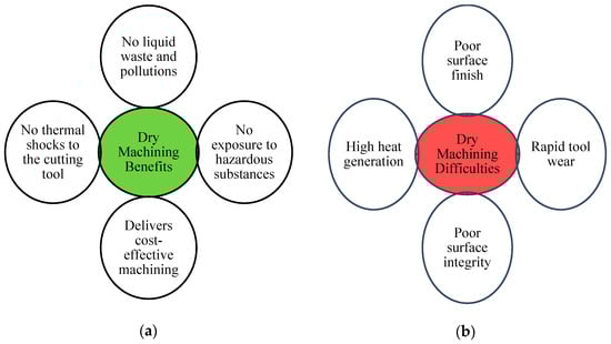 Nowadays, dry machining is a topic of global interest due to its importance for sustainable manufacturing. However, it also poses some difficulties/challenges that hinder its widespread adoption. Figure 3b illustrates some of the major difficulties that need to be overcome to make dry machining more feasible and effective. Various researchers are investigating different methods and strategies to address these challenges and improve the performance of dry machining.