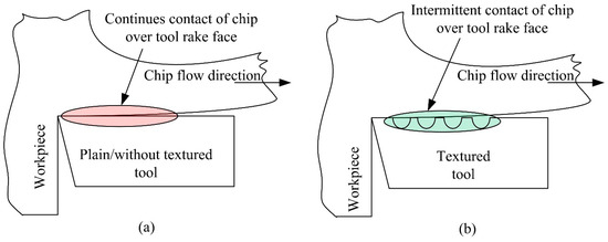 Heat generation and plastic deformation of the workpiece depend on the friction at the tool–chip interaction, and that is mainly responsible for machinability. A possible way to enhance the machinability is to create a microscale or nanoscale texture that reduces the friction [36]. Recent improvements in micromanufacturing technologies have made it possible to build useful surfaces for cutting tools, dies, and molds that are utilized in crucial manufacturing procedures. Some common techniques for fabricating textured surfaces are chemical etching, ECM: electro chemical machining, LBM: laser beam machining, and EDM: electric discharge machining [37]. The literature review by Biermann et al. [38] provides a comprehensive overview of the benefits and drawbacks of these techniques; we have not included it here since it is outside the scope of this review. Surface textured/patterned cutting tools are a new generation of cutting tools that have improved tribological performance at the tool–chip interaction [39]. Numerous studies have been conducted on cutting tools that have patterns or textures on their surfaces, because they can reduce friction and wear during machining processes. One of the earliest works that presented the concept of textured tools was by Kawasegi et al. [36]. Kawasegi et al. [36] developed microscale or nanoscale textured cemented carbide tools using a laser beam. The textured tools showed a decrease in cutting force which significantly influenced the direction of the texture. Applying textures to the rake along with the flank surfaces of tools can significantly lower the friction ~13–26% during machining processes [30,40]. The texture reduces the contact between the cutting tool and the chip in cutting. It consequently leads to a lesser amount of friction, less heat generation, and changes in the cutting temperature distribution [41]. A typical representation can be seen in Figure 4.