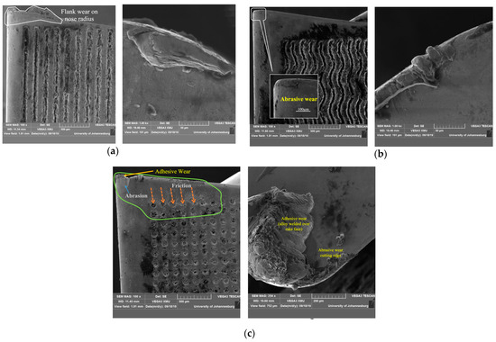 SEM images of tool wear with (a) line texture, (b) splines texture, and (c) dimple texture [55].