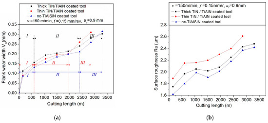 Coated tools performance comparision: (a) Flank wear, (I) initial wear, (II) stable wear, and (III) severe wear; (b) Surface roughness [65].