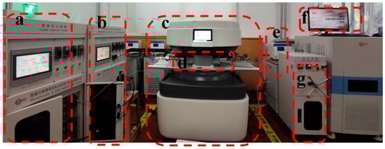 Figure 1. NMR-based online exfoliation system ((a) injection unit; (b) confining pressure unit (c) NMR unit (d) coreholder; (e) Heating unit; (f) Data acquisition unit; (g) Backpressure unit).
