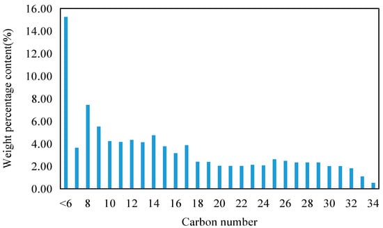 The measured crude oils’ complete hydrocarbon carbon number distribution is illustrated in Figure 2. It is evident from the data in Table 3 that the measured crude oil exhibits a relatively uniform distribution and a low overall carbon number. The predominant components of the crude oil are those with a carbon number less than seven, indicating a minimal presence of heavy components. As crude oils are relatively viscous under ambient conditions, the composition of waxes plays a significant role in determining the crude oil viscosity.