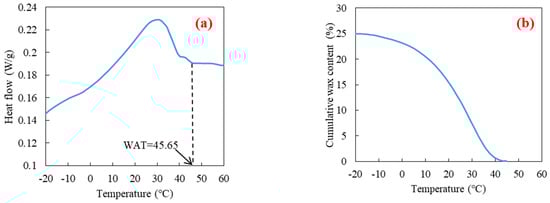 Figure 3. DSC test results of oil samples: (a) heat flow curve; (b) cumulative wax precipitation curve.