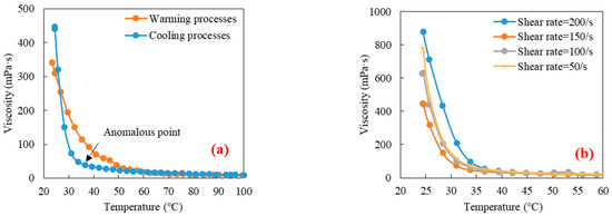 Figure 4. Crude oil viscosity–temperature curves: (a) viscosity–temperature curves for crude oil at 150 s−1; (b) viscosity–temperature curves at different shear rates.