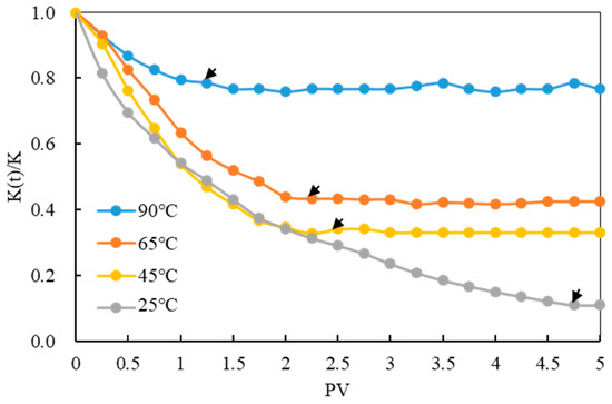 Figure 5. Normalized permeability curve changed with injection volume at different temperatures. (Oil-phase permeability basically ceases to change after the arrow).