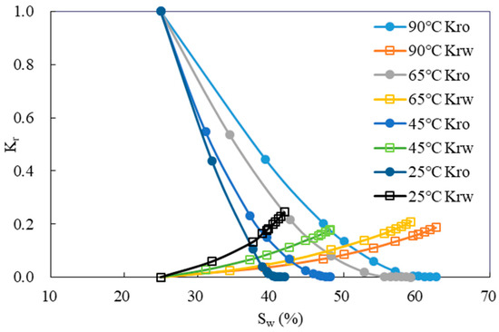 Figure 6. Oil–water relative permeability curves at different temperatures.