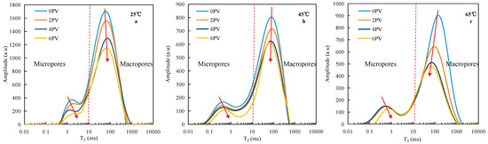 Figure 7. T2 spectrum changed with PV at different temperatures: (a) 25 °C; (b) 45 °C; (c) 65 °C. (The red dashed line is the boundary between large and small pores, and the arrow is the direction of the peak change of the T2 spectral line).