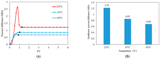 Figure 8. The pressure difference curves at different temperatures: (a) pressure difference curve; (b) equilibrium pressure difference. (Pressure equilibrium point is indicated by the arrow).